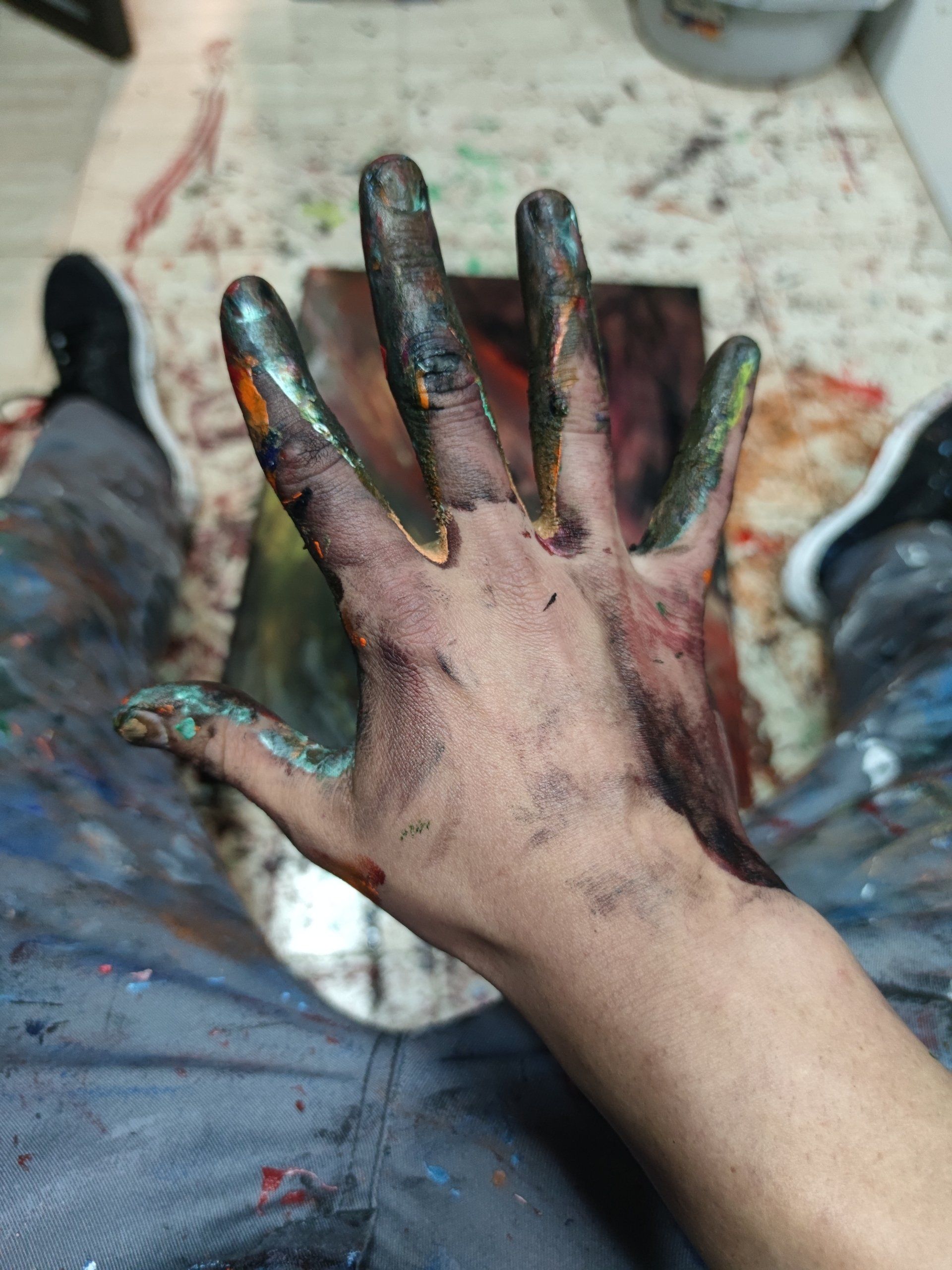 When making different layers in paints, it take life, the relief is very sharps and on applying the layers by hands, sometimes they produce small cuts on my hands that cause blood mixes with the colors which create connection with the paintings and painter. Paintings acquires Life which make an unexplained sense of difference from a inclusive way.